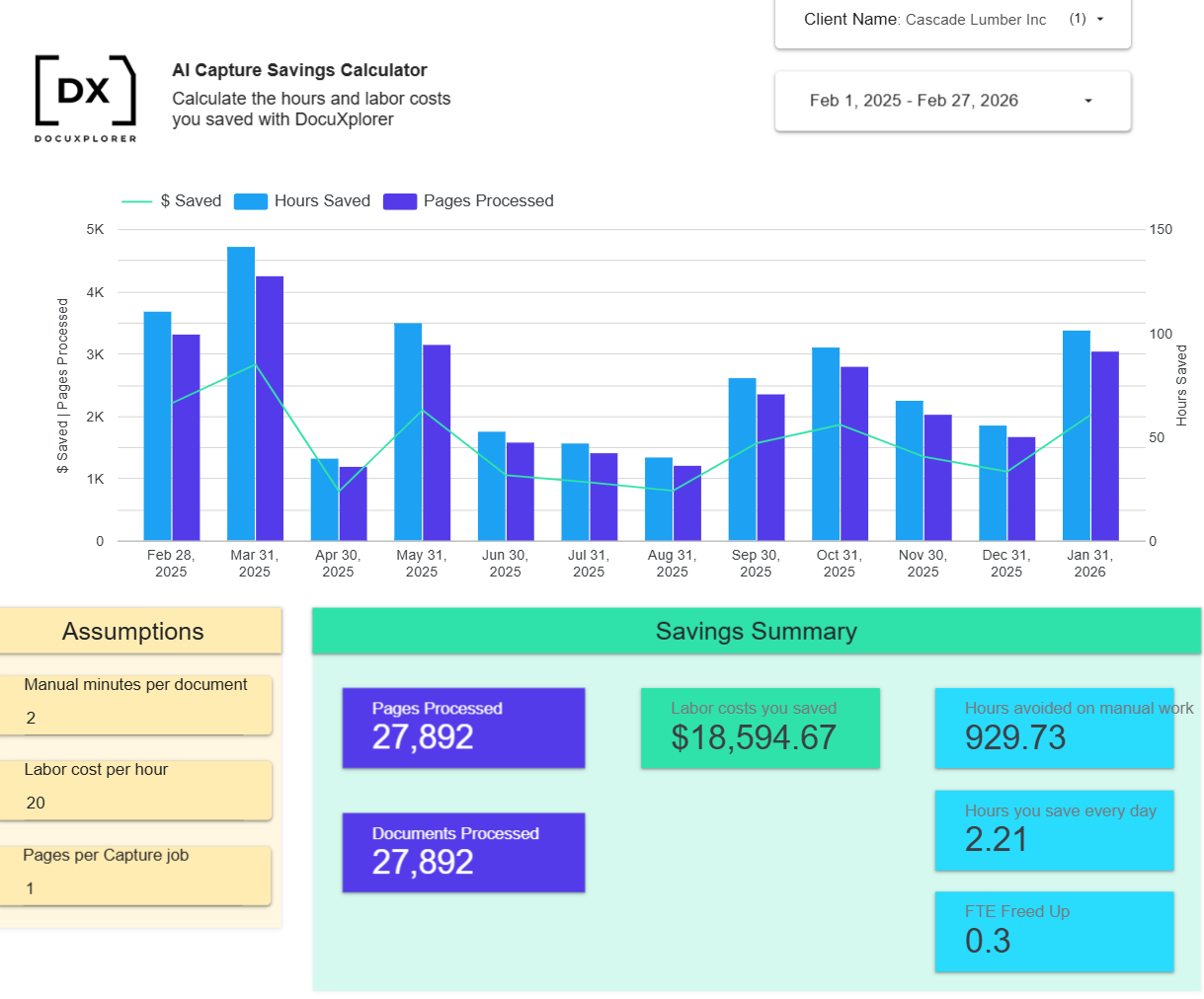 That improvement is also reflected in the usage data from Cascade Lumber’s first year of AI Capture. The team processed 27,892 pages and saved nearly 930 hours of manual work, which amounts to $18,594.67 in labor savings.