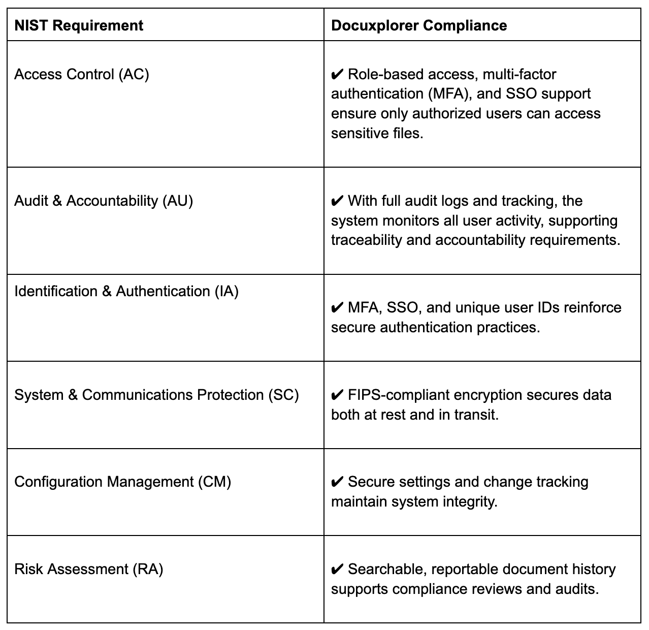 While CMMC covers a broad range of cybersecurity requirements, several areas are directly linked to document management. DocuXplorer addresses these key NIST 800-171 controls: